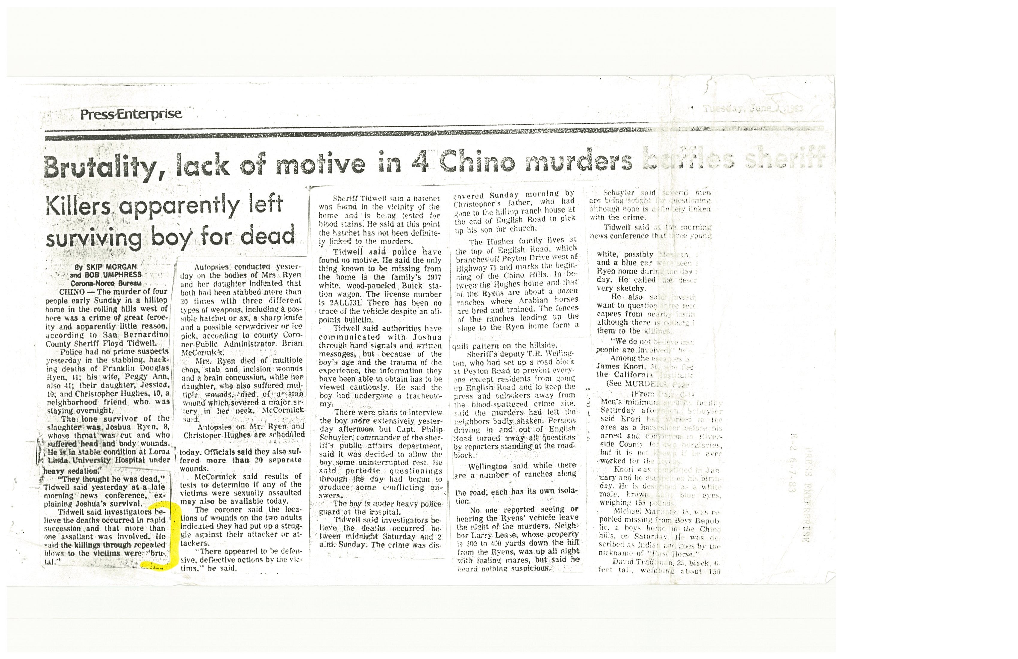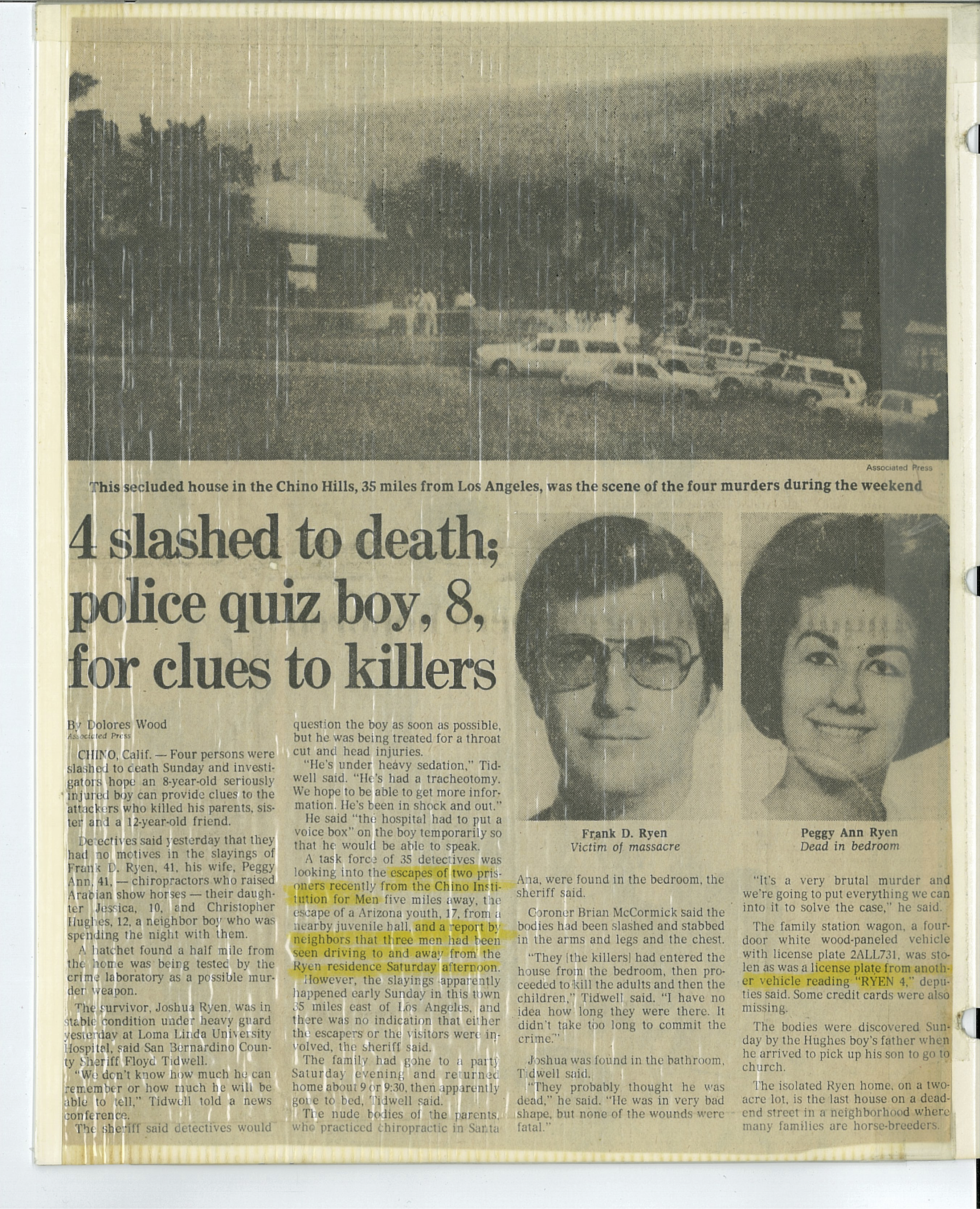 - Murders are discovered around 11AM. Survivor, Joshua Ryen is airlifted to hospital.