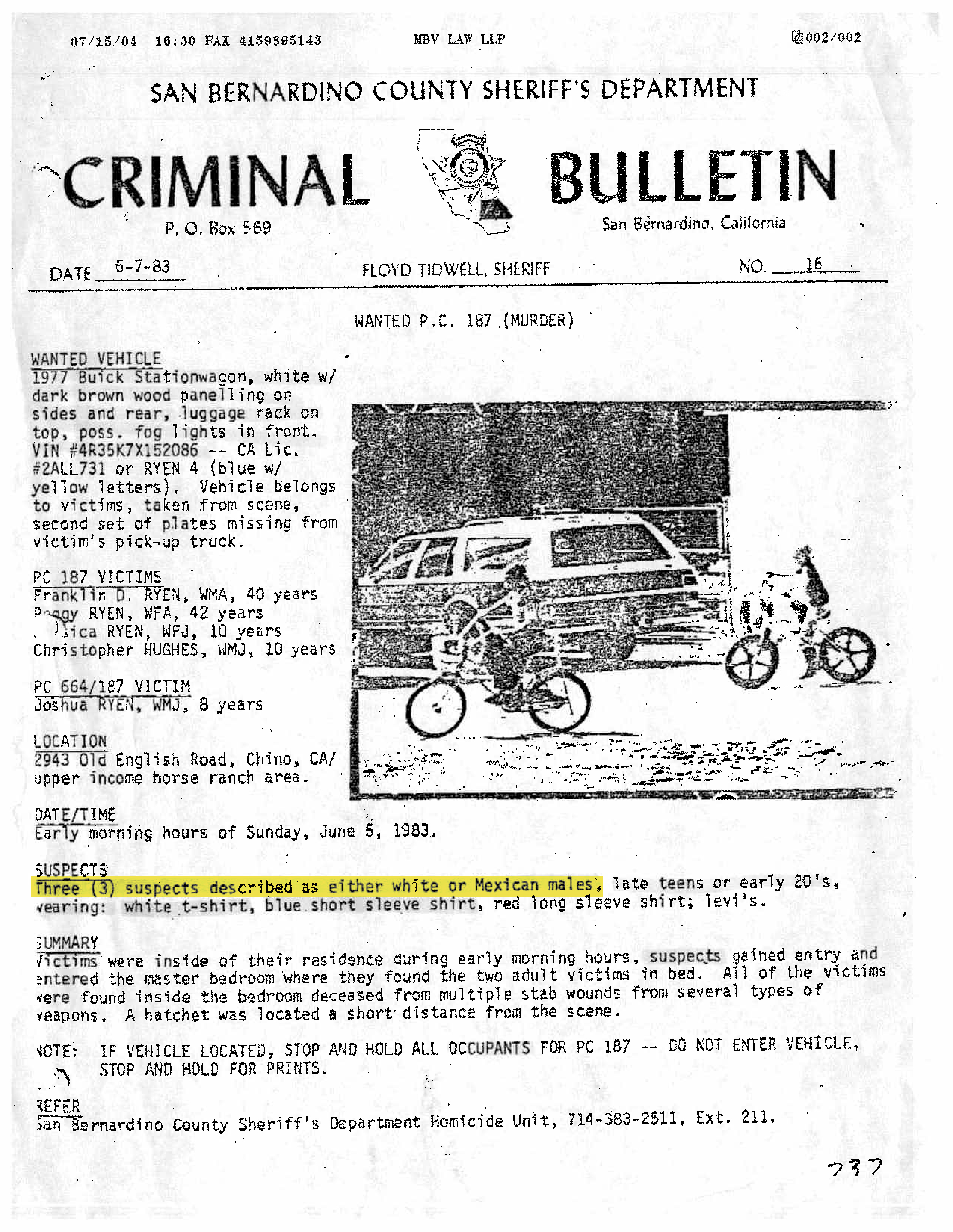 - A Crime Bulletin was issued for 3 White or Hispanic males in connection with the murders.