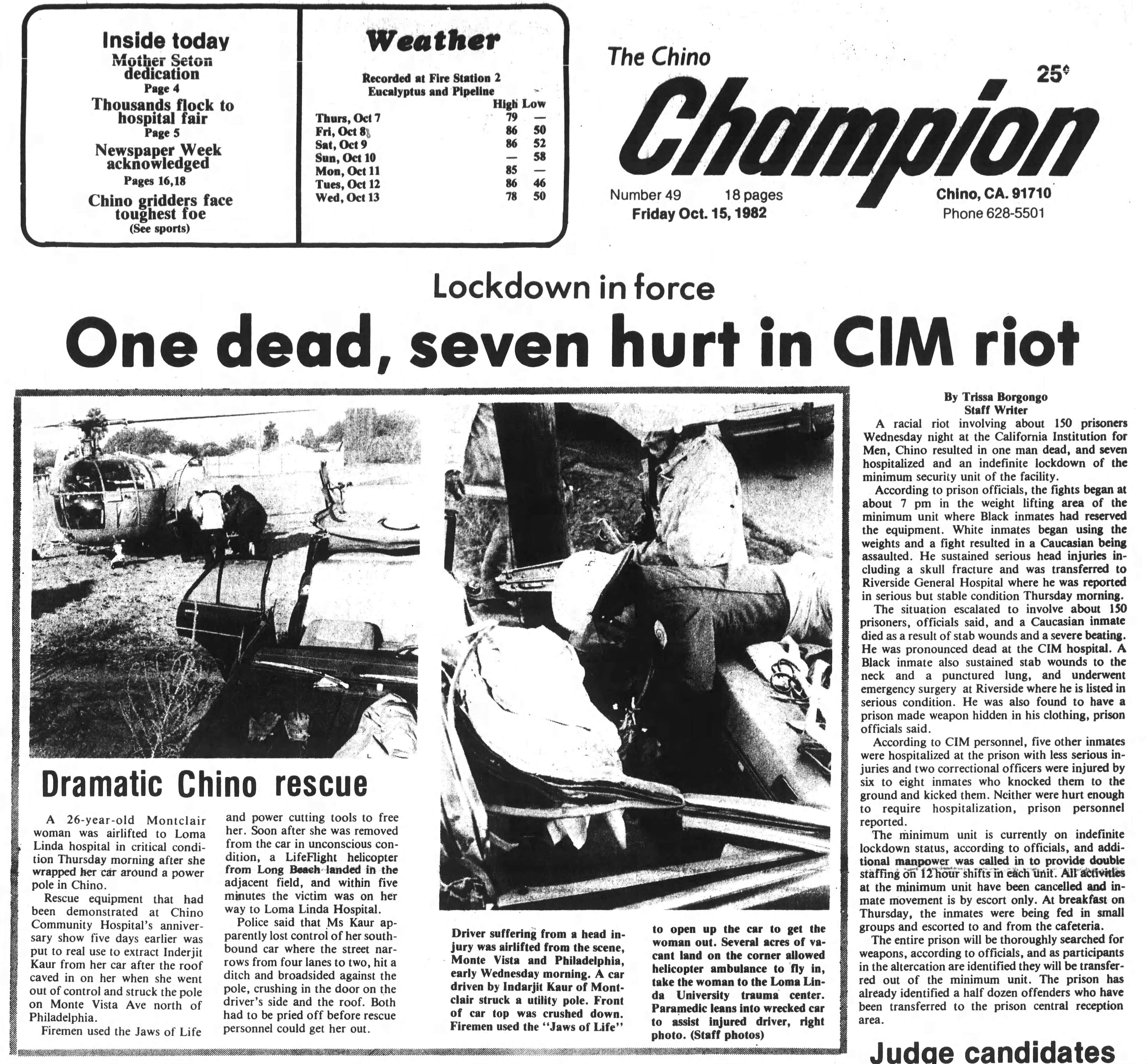In early 1982, the State of California was actively legislating to expand the CIM along with several other state prisons. The outraged Chino Hills community successfully lobbied against this and the CIM expansion was removed from the bill. The CIM was seriously overcrowded, housing one third above capacity. There were chronic escapes, with a total of 22 that year. In October, there was a race riot at CIM that killed 1 prisoner, wounding 7.