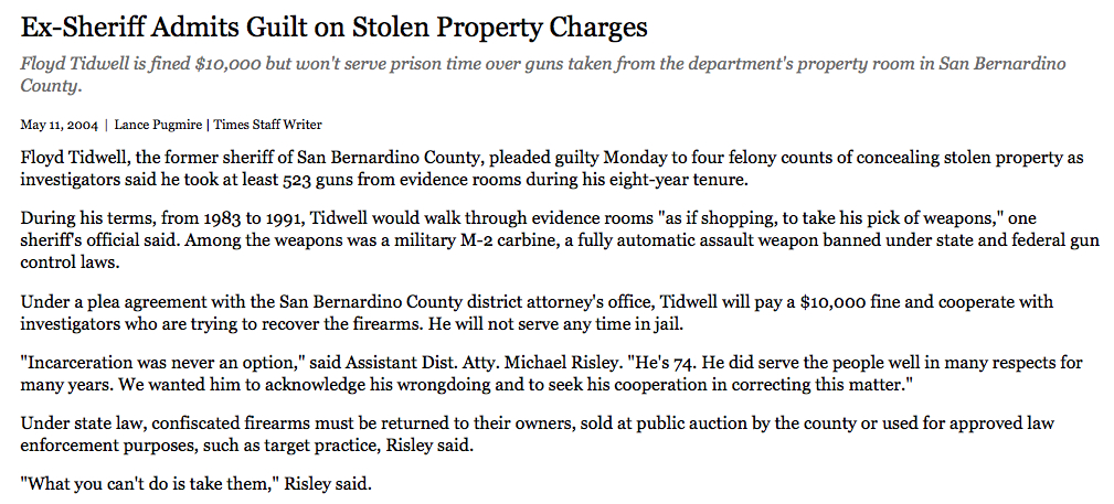 In 2004, Floyd Tidwell, who was Sheriff for the San Bernardino County Sheriff’s Department (SBCSD) from 1983 to 1991, pled guilty to felony charges of stealing over 530 confiscated weapons from the evidence lockers during his entire term of service. These thefts were discovered during a 2004 search related to charges of conspiracy conducted on Floyd Tidwell’s son, Daniel. Mr. Tidwell had given several of the stolen guns to Daniel and they still had evidence tags attached. One sheriff’s department official said that Floyd Tidwell routinely walked through the evidence rooms “as if shopping, to take his pick of weapons.“